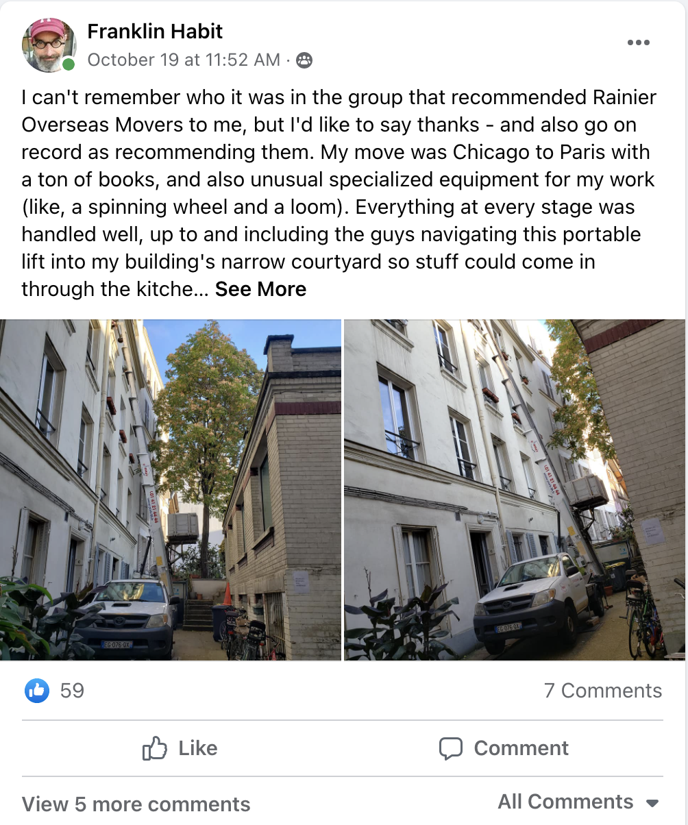 I couldn’t be happier with every stage of the process, from our communications to the packing up in Chicago through to the delivery here. All the contacts were proactive, clear, and polite; and all the crews were marvelous. The crating service did a superb job with my weird, fragile equipment. My apartment situation at the Paris end has tricky logistics (even by Paris standards) and they guys were absolute magicians at making it work out. They were in and out in about 2 hours, including getting the lift into the narrow courtyard.