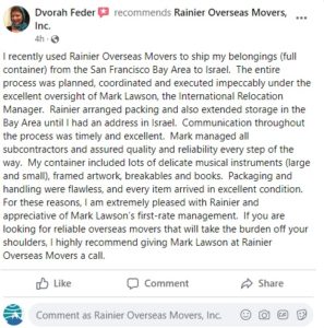 Wanted to thank you for all your help. You were great to work with. Answered all my questions quickly and made everything really easy for us every step of the way. No issues at all with the people packing/moving our belongings. Will definitely be recommending you to anyone looking to do an international move.
