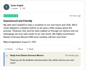 Sent: Tuesday, September 10, 2024 12:11 PM Subject: International Move to Chile Rainier Overseas Movers reviewed by Tucker English on 9/10/2024 (trustpilot.com)